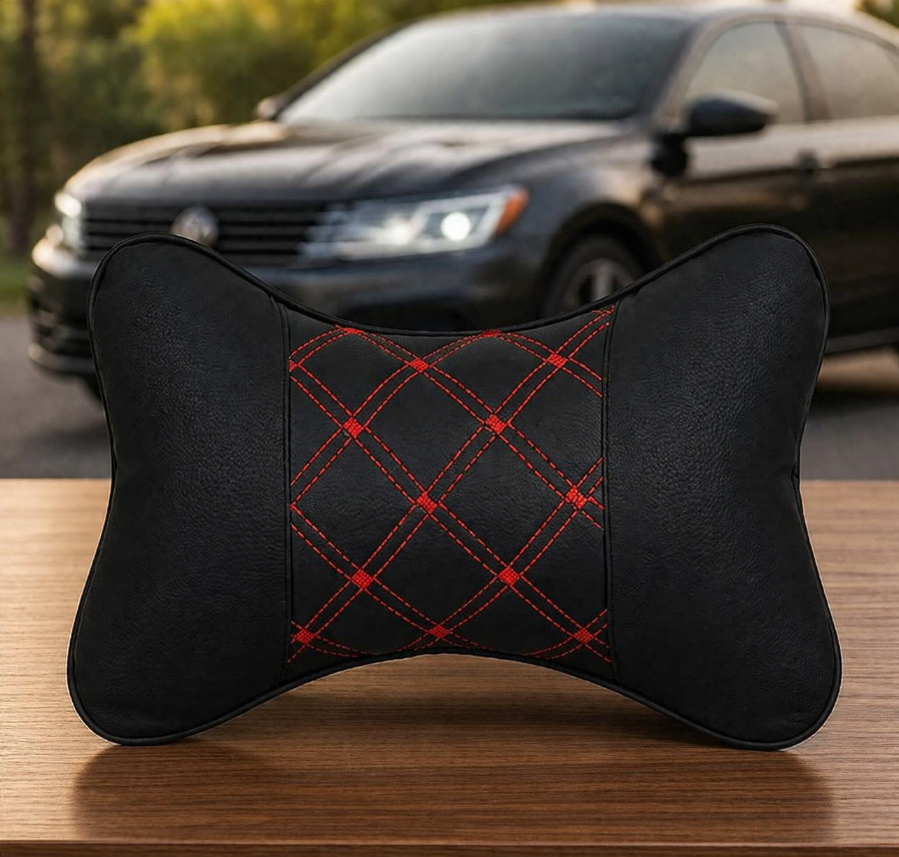 Mejora tu comodidad al conducir con esta almohada apoya cabeza universal, diseñada para brindar soporte ergonómico y un estilo moderno con líneas de colores sobre ecocuero negro.