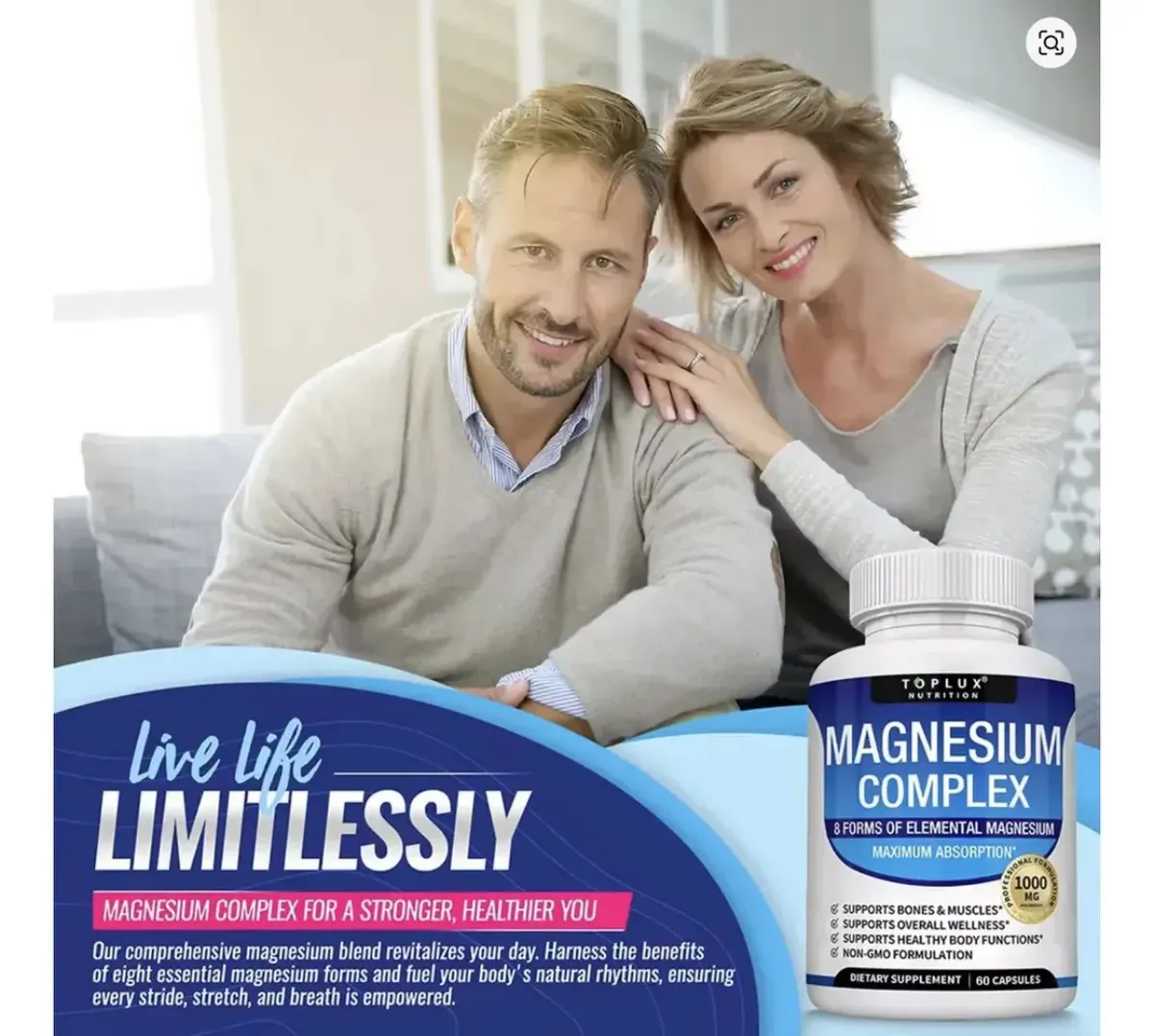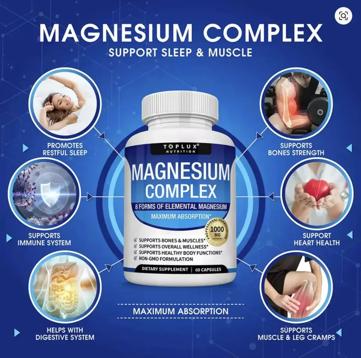 El Magnesio Complex de 8 elementos 60 capsulas (o 8 formas) es un suplemento de "espectro completo". A diferencia de los suplementos comunes que solo traen un tipo de magnesio (como el citrato), este combina ocho fuentes distintas para asegurar que el cuerpo lo aproveche en diferentes niveles: desde los músculos hasta el cerebro y el sistema digestivo.